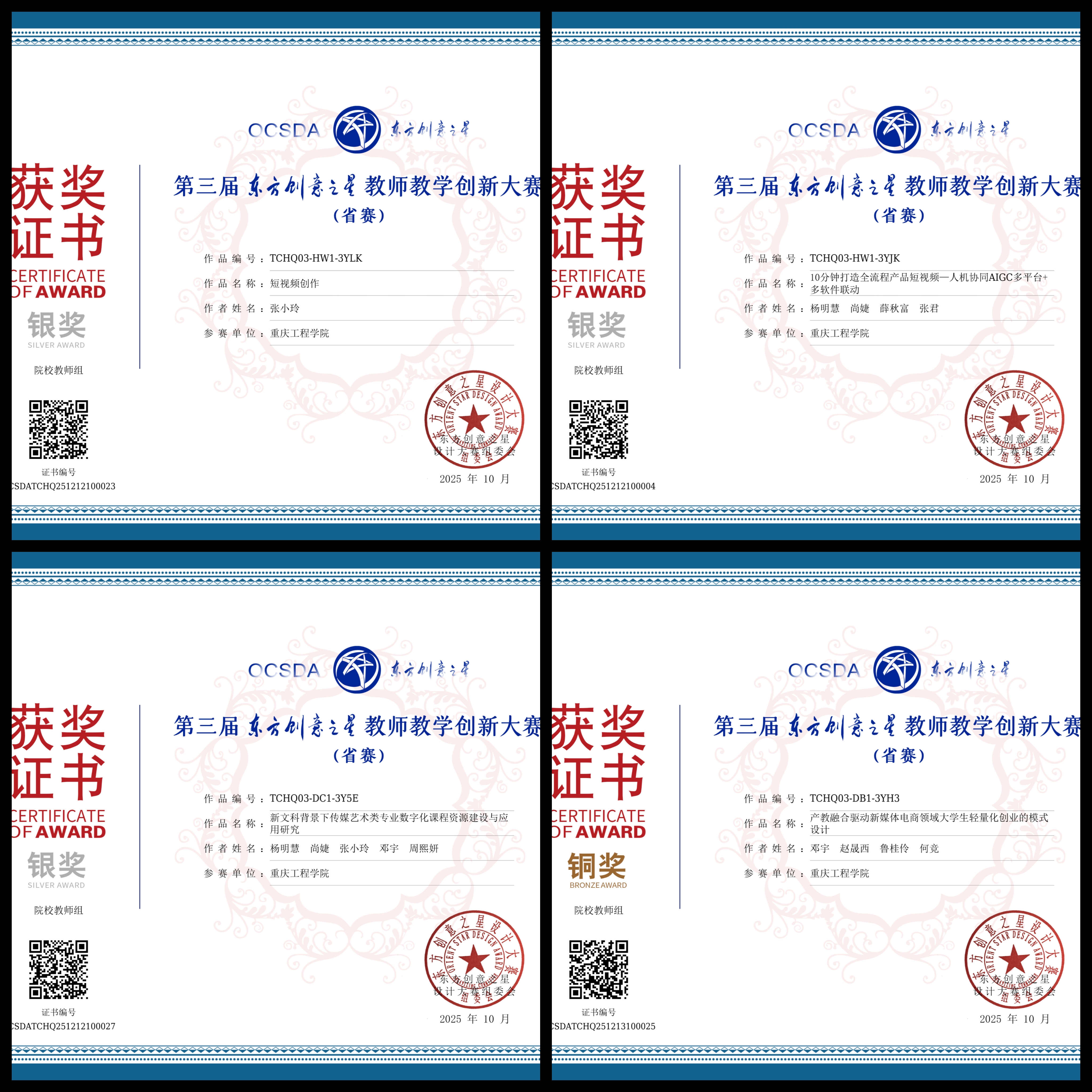近日,第三届东方创意之星教师教学创新大赛获奖名单正式公布,重庆工程学院新媒体电商学院凭借出色的教学创新成果,共荣获7个奖项,包括特金奖1项、金奖2项、银奖3项、铜奖1项,展现了学院在教育教学改革领域的扎实积累与创新突破。
