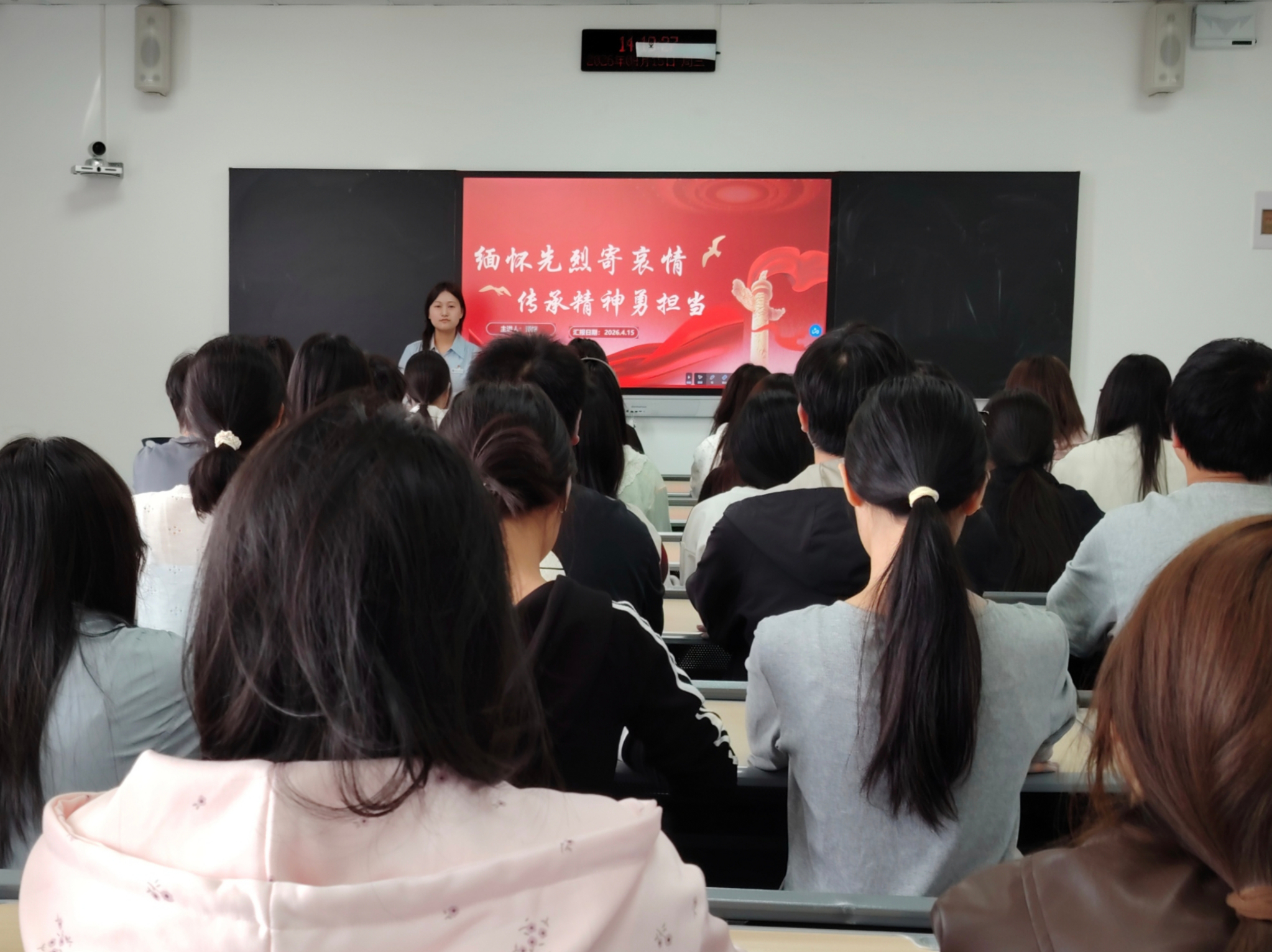本网讯(文/图 胡梦娇)为缅怀革命先烈、传承红色精神,引导青年学子厚植家国情怀、勇担时代使命,2026年4月15日,新媒体电商学院党员实践教育中心在双桥校区三教206教室开展“缅怀先烈寄哀思,传承精神勇担当”主题红色教育活动。本次活动由潘妍同学主讲,全院55名党性分子参与。