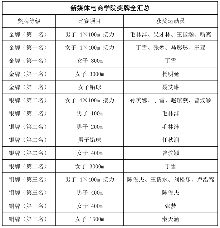 从精心选拔到刻苦训练,从方阵赛场的整齐震撼,到田径赛道的奋力冲刺;从团体总分的遥遥领先,到各项赛事的奖牌丰收。新媒体电商学院以团结、拼搏、奋勇争先的精神,书写了属于自己的辉煌篇章!每一份荣誉都来之不易,每一位学子都闪闪发光! 为新电骄傲,为新电喝彩!
