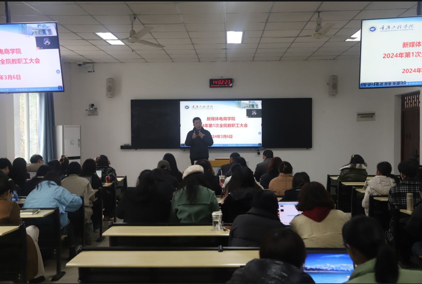 2024年3月6日下午14:00,新媒体电商学院在6教115教室召开了2024年第1次全院教职工大会。新媒体电商学院全体教职工参加会议。本次会议由学院党总支书记邹均主持。