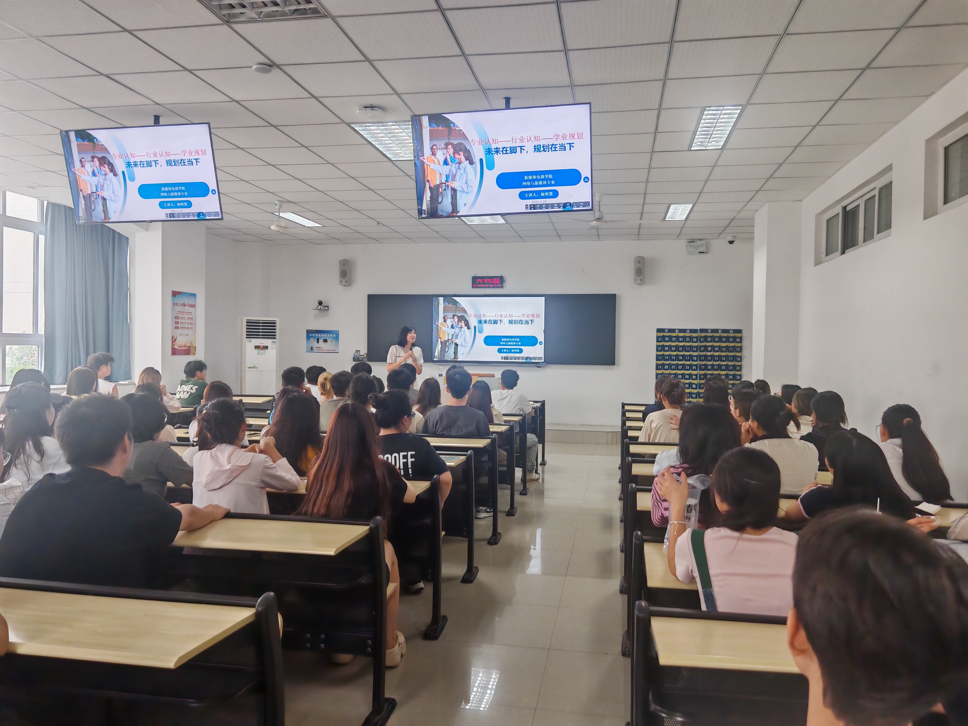 2024年9月20日,新媒体系主任杨明慧老师与尚婕老师在学院双桥校区,共同为网络与新媒体专业2024级普通本科新生及专升本新生举办新生见面会暨专业教育活动。此次活动,标志着新生们正式踏上了专业学习的新征程。