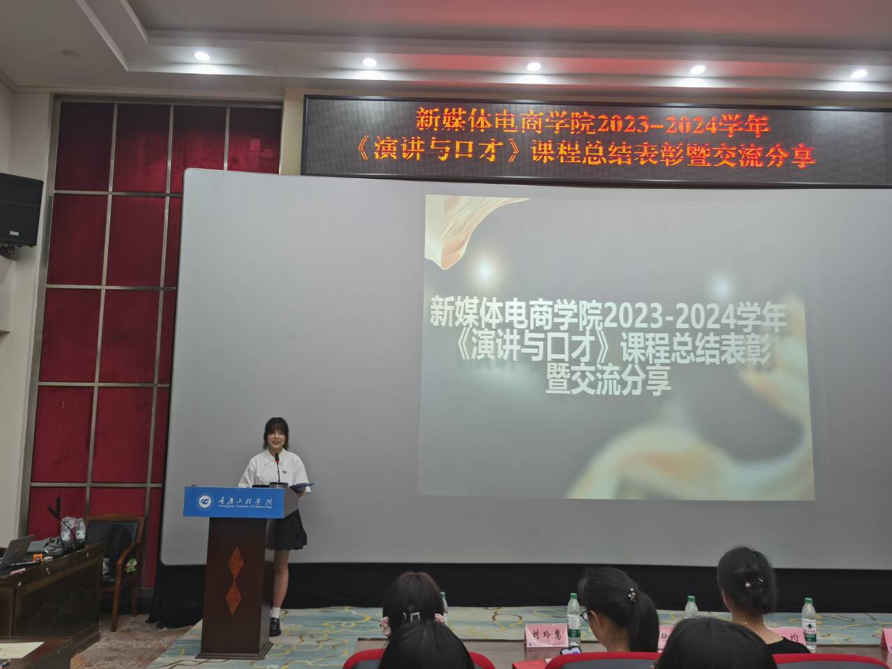 9月25日晚上,新媒体电商学院在办公楼报告厅召开了2023-2024学年《演讲与口才》课程总结表彰暨交流分享大会。新媒体电商学院党总支书记、院长邹均,学校大学生素质教育中心主任邹春霞教授,学生科副科长曾艳灵,大二、大三年级辅导员出席了大会,学院部分2023级学生参加了此次大会,大会由22网媒专业刘奕然同学主持。