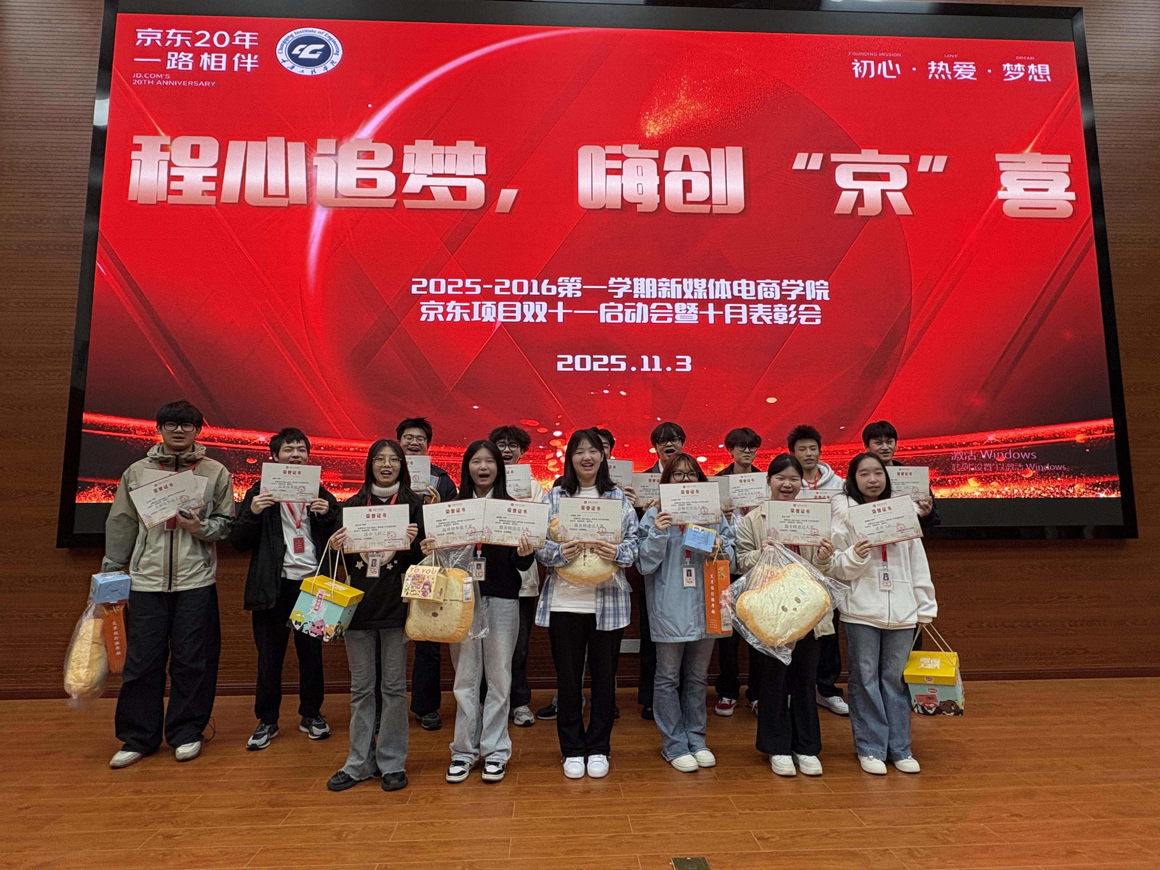 2025年11月3日15时50分至17时,新媒体电商学院于双桥校区S3605报告厅隆重举办2025–2026学年第一学期“2025年度京东项目10月表彰仪式”。江苏京东信息技术有限公司众客服运营部重庆工程双桥站点运营主管储玲玲,学院院长严伟、院长助理吴诗奎、京东项目负责人曾霞,实训指导教师扶小雪、芦亚柯、代俊敏,24级电子商务专业辅导员谢媛,主持人李子云、陈楠,以及24级电商1–3班京东实训全体学生共同参会。