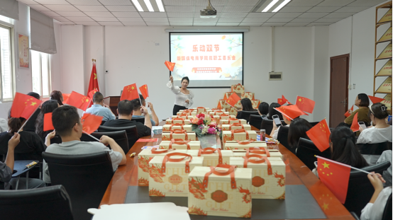 活动在《我和我的祖国》合唱声中达到高潮,全体教职工手持彩旗齐声高唱,熟悉的歌词、真挚的歌声,将家国情怀与节日温情交融。活动结束后,学院领导为老师们送上精心准备的中秋伴手礼,让大家感受到学院大家庭的温暖与关怀。
